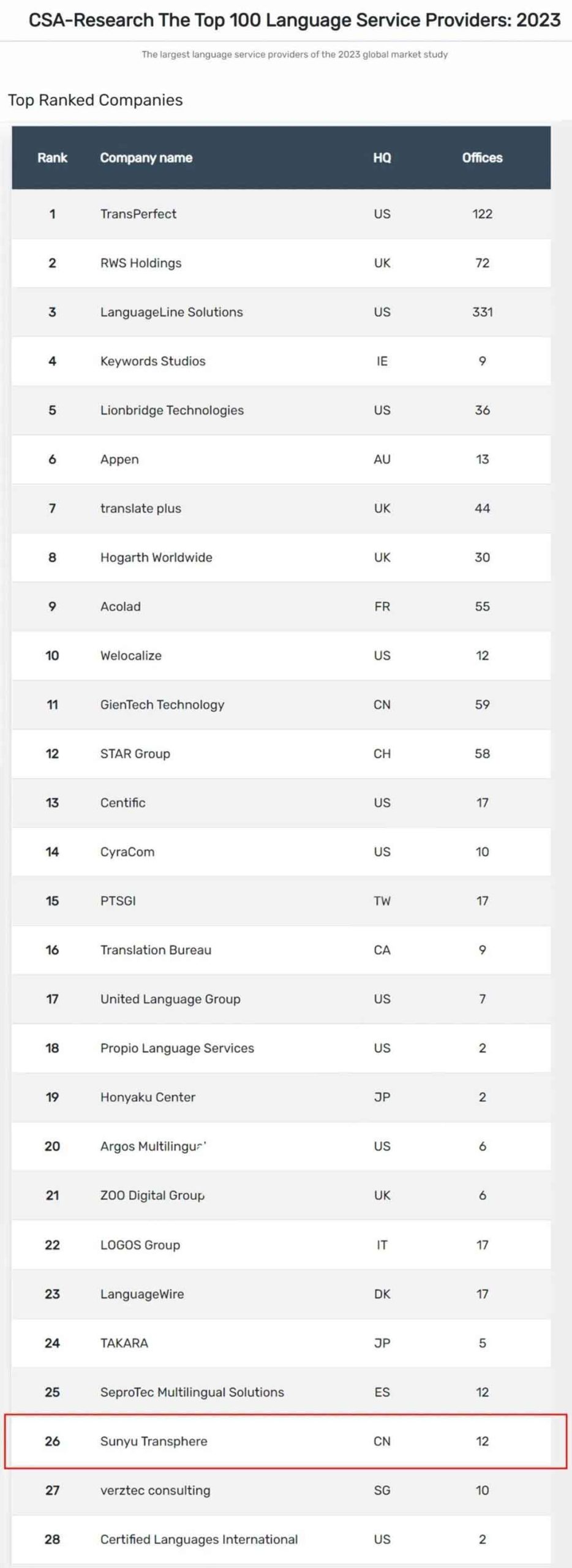 In the global CSA ranking, we have been listed for seven years and achieved a solid rank of 26th in 2023. As a specialized healthcare translation service provider, Transphere possesses significant advantages in medical translation services due to its professional capabilities, confidentiality measures, and high-quality translation abilities.